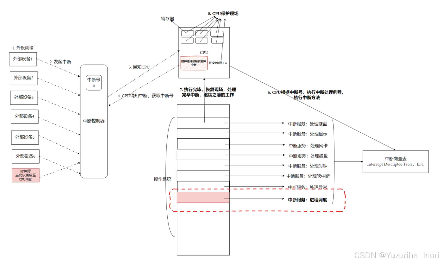 作用:当外设准备好的时候,会直接中断控制器发送中断,中断控制器会通知CPU:已经有外设准备好了!CPU得知后会向中断控制器获取准备好的外设的中断号,随后在中断向量表中,根据中断号,找到对应的中断服务,CPU执行对应服务。