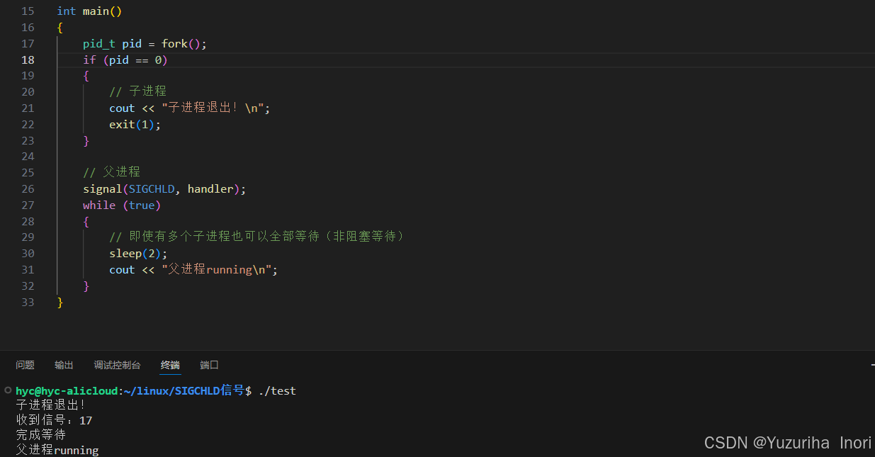 解除循环!SIGCHLD信号,其实是子进程在终止时向父进程发送的信号。不过这个给信号的默认执行动作一般都是忽略,起到一个通知的作用。 我们可以通过SIGCHLD信号,自定义处理动作来让父进程回收子进程