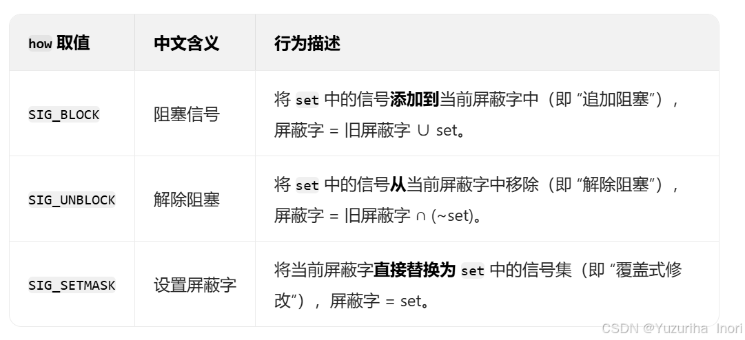 int sigprocmask(int how, const sigset_t *set, sigset_t *oset);