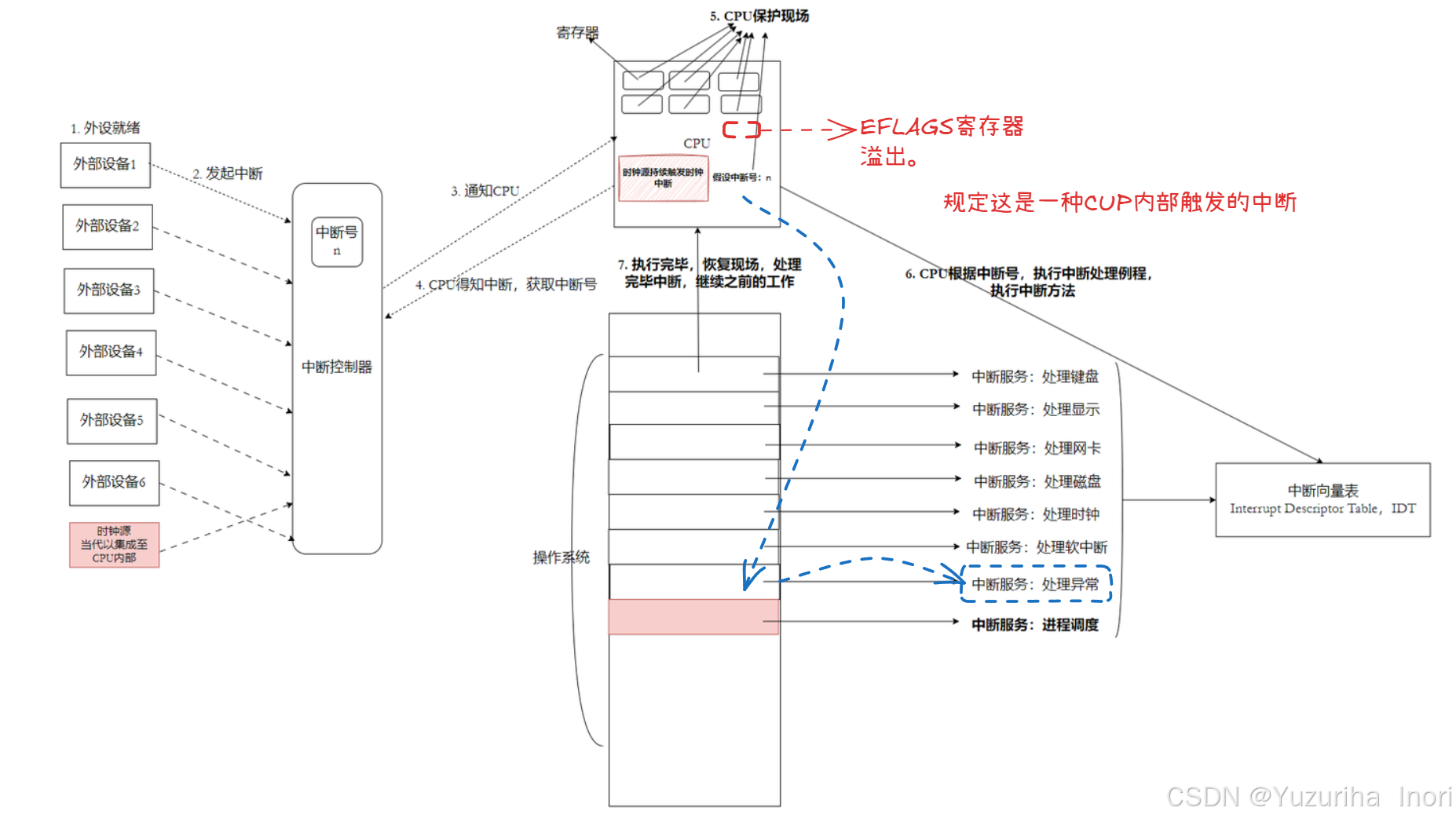 例如除0错误,引发EFLAGS寄存器硬件,发生CPU内部的中断!