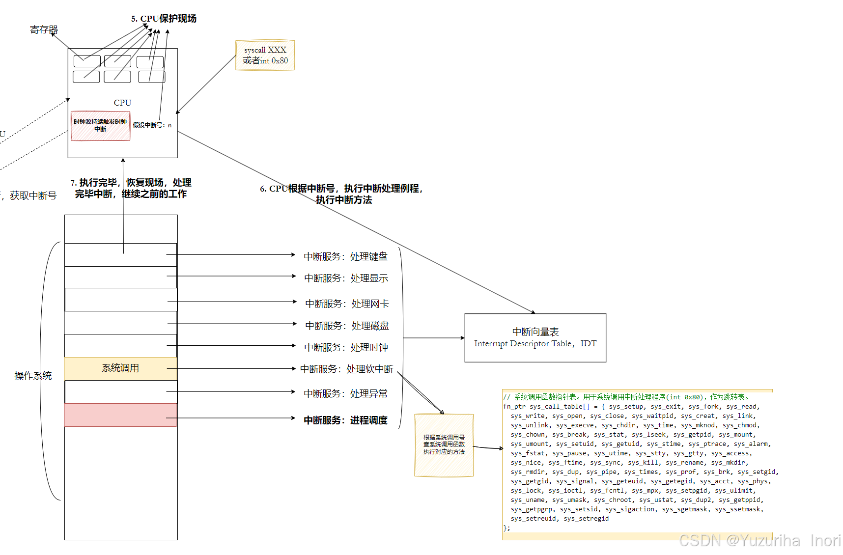 中断向量表:是操作系统的一部分,在操作系统启动时就加载到内存中了。其本质可以理解为:函数指针数组,中断号就是其下标!