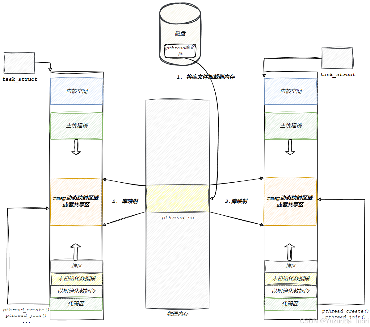 Linux下的线程是由线程库提供的,而库是满足EIF文件格式,动态库会加载到物理内存空间中,然后再映射到需要的虚拟地址空间中共享区!