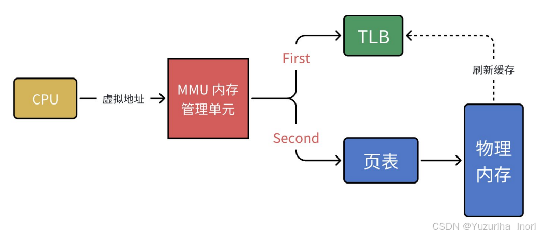 为了提高转化地址的效率,MMU引入了TLB(Translation Lookaside Buffer,缓存),其中存储最近频繁使用的映射关系!MMU做虚拟地址与物理地址的转化时,先去TLB中查询,若没有,则再去页表中查询!