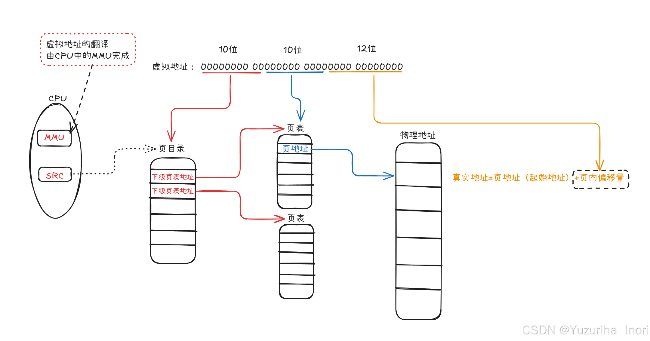 中间10位:表示指向页表的地址,其中页表中保存的是页地址(起始地址)。