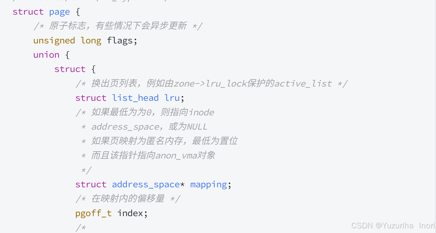 page描述了页框的各种信号,其中包含了页框的状态:是否被使用,是否被锁定等等。