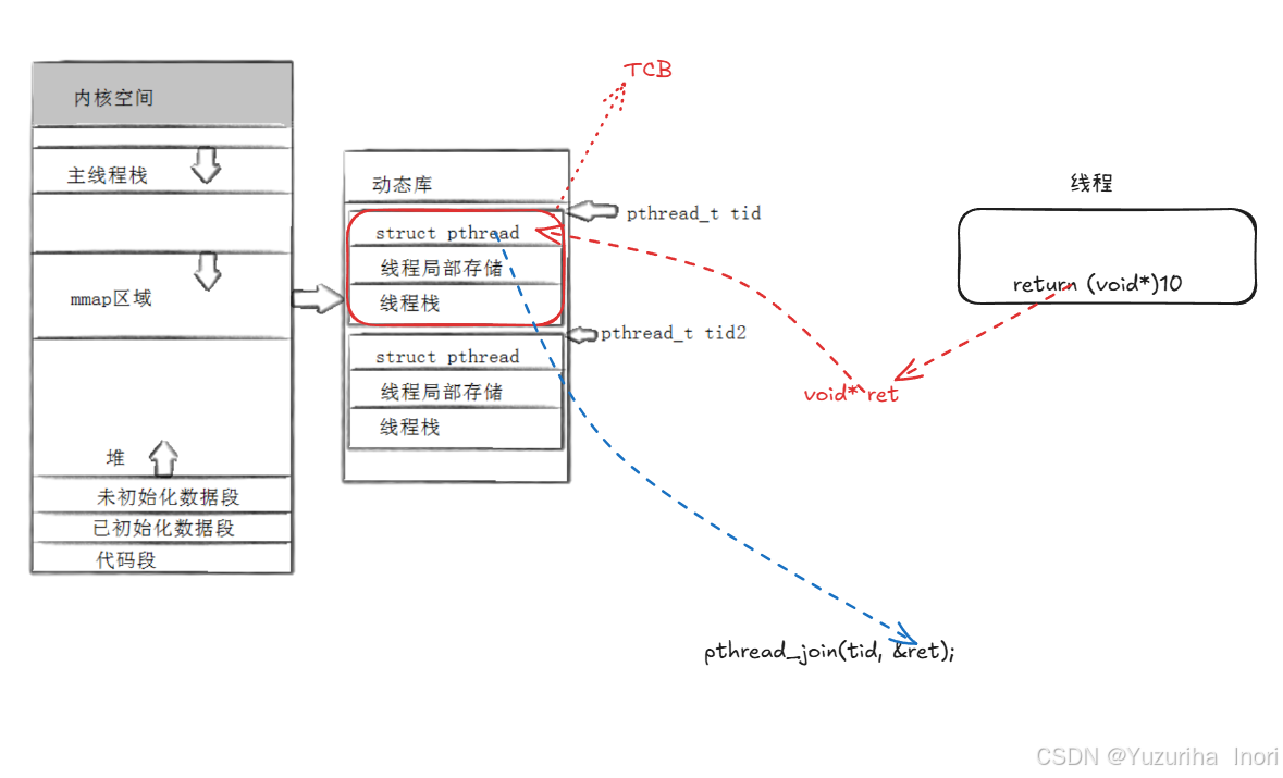 TCB分为3大部分:struct pthread、线程局部存储、线程栈。其中每一个线程都必须有对应的线程栈!因为线程栈主要用于存储代码的临时数据。注:主线程的栈空间并不在线程库中!