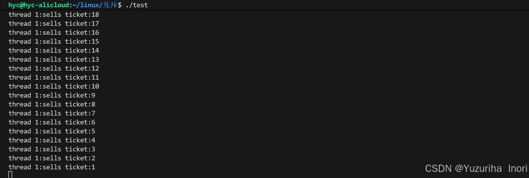 那么,当一个线程执行上述代码时。因为ticket--操作不是原子的,所以ticket--操作的3个步骤没执行完就被剥离走是常见的情况!那么当一轮执行完成后,没有执行完的线程又会回来继续执行,但没有执行完的线程的上下文数据会直接覆盖CPU中的寄存器,接着执行。这意味着,在这个线程之前的线程所做的一切都没有意义,会被当前这个线程之间覆盖掉!!!