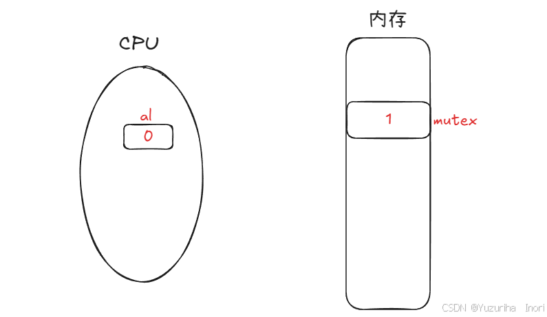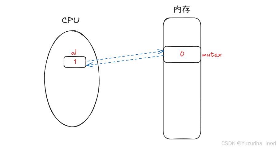 首先,该线程保存上下文并被剥离CPU,此时mutex已经被交换为0值了。然后新线程加载之CPU,进行重置为0、交换操作。 此时不论时寄存器al,还是mutex都是0值了,交换了之后依然是0值。所以判断当前这个新线程申请锁失败!
