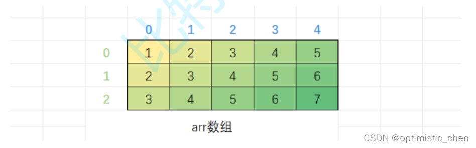 数组类型 数组[常量值][常量值] int arr [3] [5];