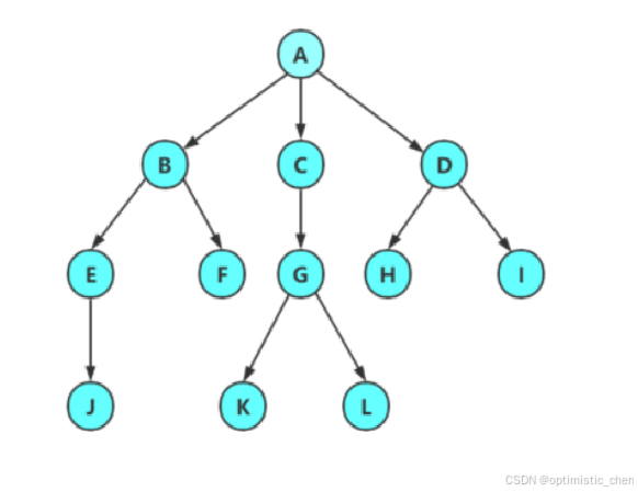 非必要概念 非终端结点或分支结点:度不为0的结点; 如上图:D、E、F、G…等节点为分支结点 兄弟结点:具有相同父结点的结点互称为兄弟结点; 如上图:B、C是兄弟结点 堂兄弟结点: 双亲在同一层的结点互为堂兄弟;如上图:H、I互为兄弟结点 结点的祖先: 从根到该结点所经分支上的所有结点;如上图:A是所有结点的祖先 子孙: 以某结点为根的子树中任一结点都称为该结点的子孙。如上图:所有结点都是A的子孙 森林:由m(m>=0)棵互不相交的树组成的集合称为森林