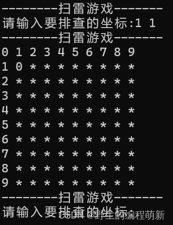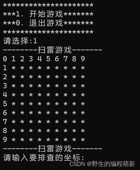 InitBoard(show,ROWS,COLS,"*");//初始化棋盘,mine数组最开始全是"0",show数组最开始全是"*".