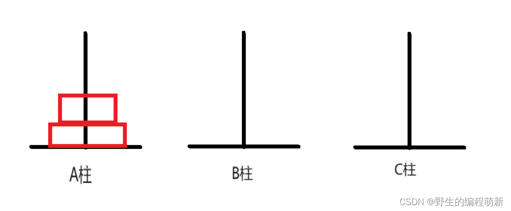 当起始柱上有 2 个圆盘时,移动过程是:先将A柱上的 1 个圆盘移动到B柱上,然后将A柱上遗留的圆盘移动到C柱上,最后将B柱上的圆盘移动到C柱上。