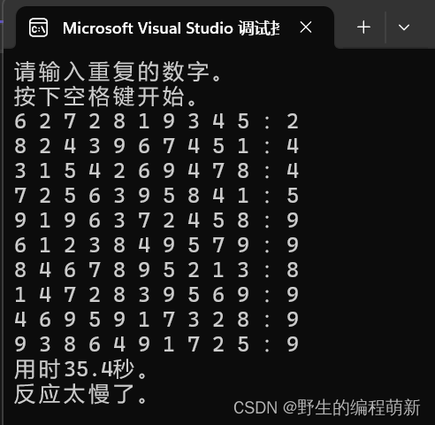 现在我们再写一个程序,这次不抽出数字,而是重复显示数字,然后让玩家找到这个重复的数字。显示的数字一共有10个,比找幸运数字时要多,不过一旦习惯了,反而更容易找到,我们来实现一下: