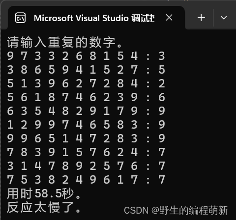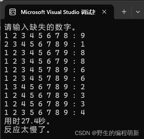 在上面这个程序中训练次数有10次,程序不接受错误的答案,其中的do...while循环负责读取从键盘输入的答案,斌判断答案是否正确,变量no读取到的值只要不等于之前在复制时跳过的dgt[x],do...while语句就会循环,因此,只要玩家没有输入正确答案,就无法进入下一个问题。10次训练结束后,程序会显示出玩家所用的时间和对玩家的评价(反应快还是反应慢)。