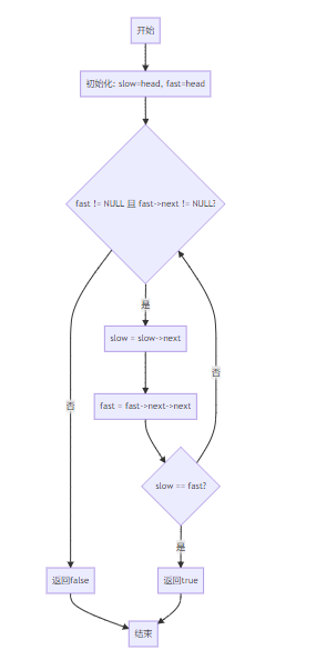 slow(慢指针/乌龟)和fast(快指针/兔子),同时从链表头部出发。slow指针每次移动一步,fast指针每次移动两步。NULL)。head。fast != NULL && fast->next != NULL,确保快指针不会访问空指针的成员,避免程序崩溃。slow == fast),说明链表有环,返回true;否则循环结束后返回false。
