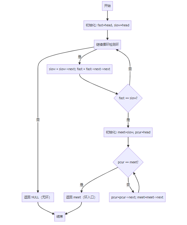 fast 和慢指针 slow 均指向链表头 head;fast != NULL && fast->next != NULL(避免快指针访问空指针崩溃);slow 每次走1步,fast 每次走2步;fast == slow,说明链表有环,记录相遇点 meet(meet = slow = fast),进入阶段2;若循环结束未相遇,说明无环,返回 NULL。pcur 指向链表头 head,meet 保持在之前的相遇点;pcur != meet;pcur 和 meet 每次均走1步(速度比1:1);pcur == meet 时,两指针同时到达环的入口节点,返回该节点(pcur 或 meet 均可)。fast、slow、meet、pcur),无额外空间开销;