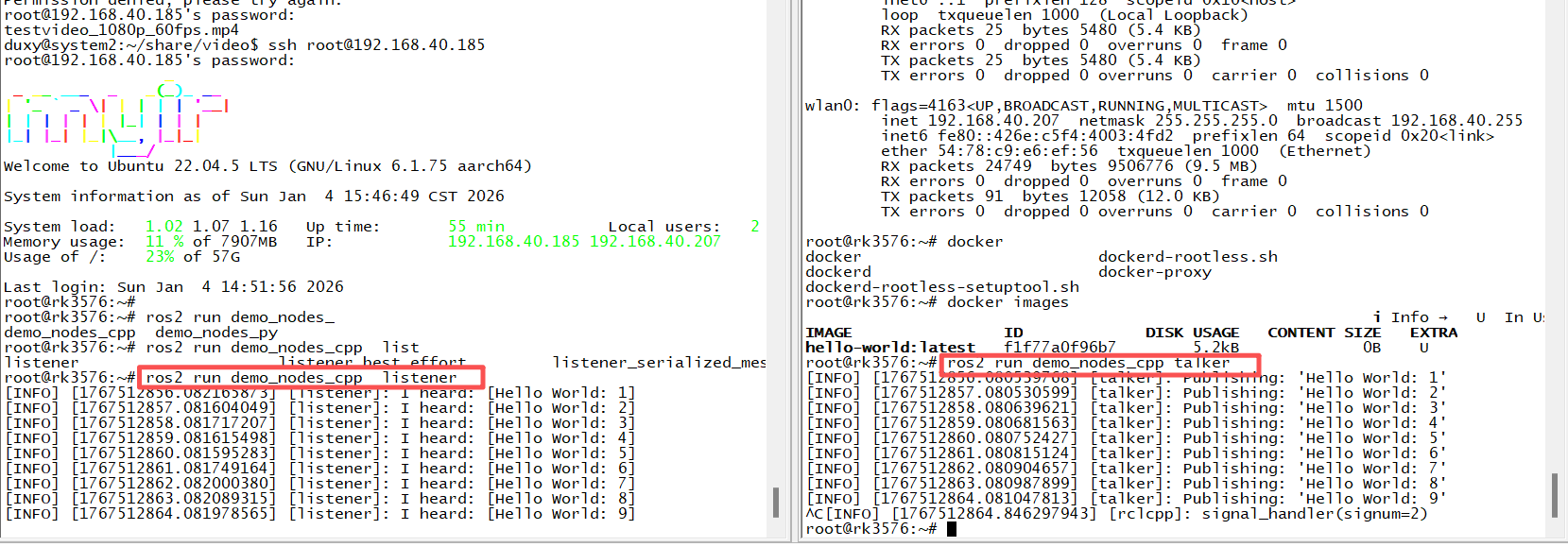 左边窗口ssh登录,订阅模式; 右边窗口debug连接,话题发布