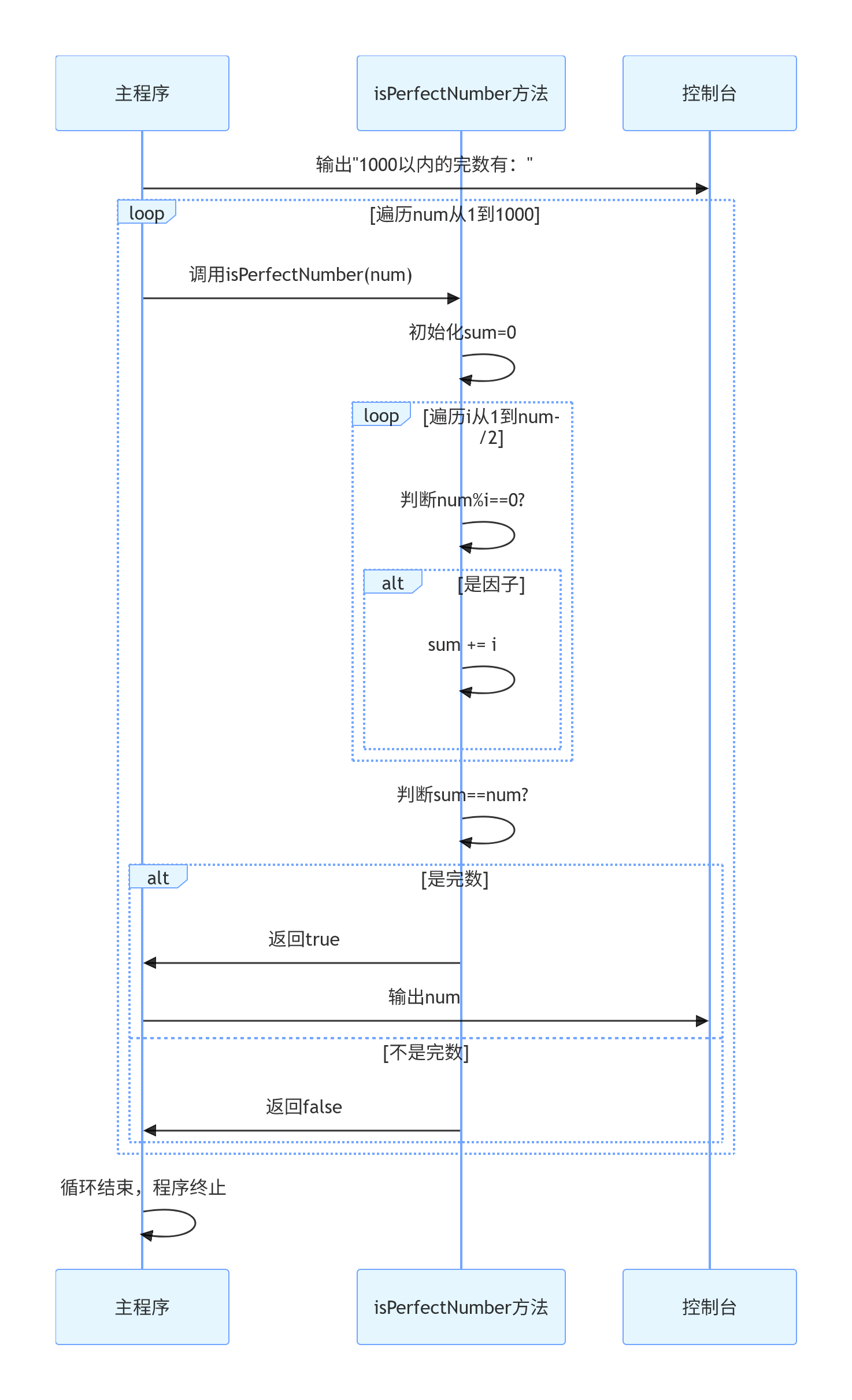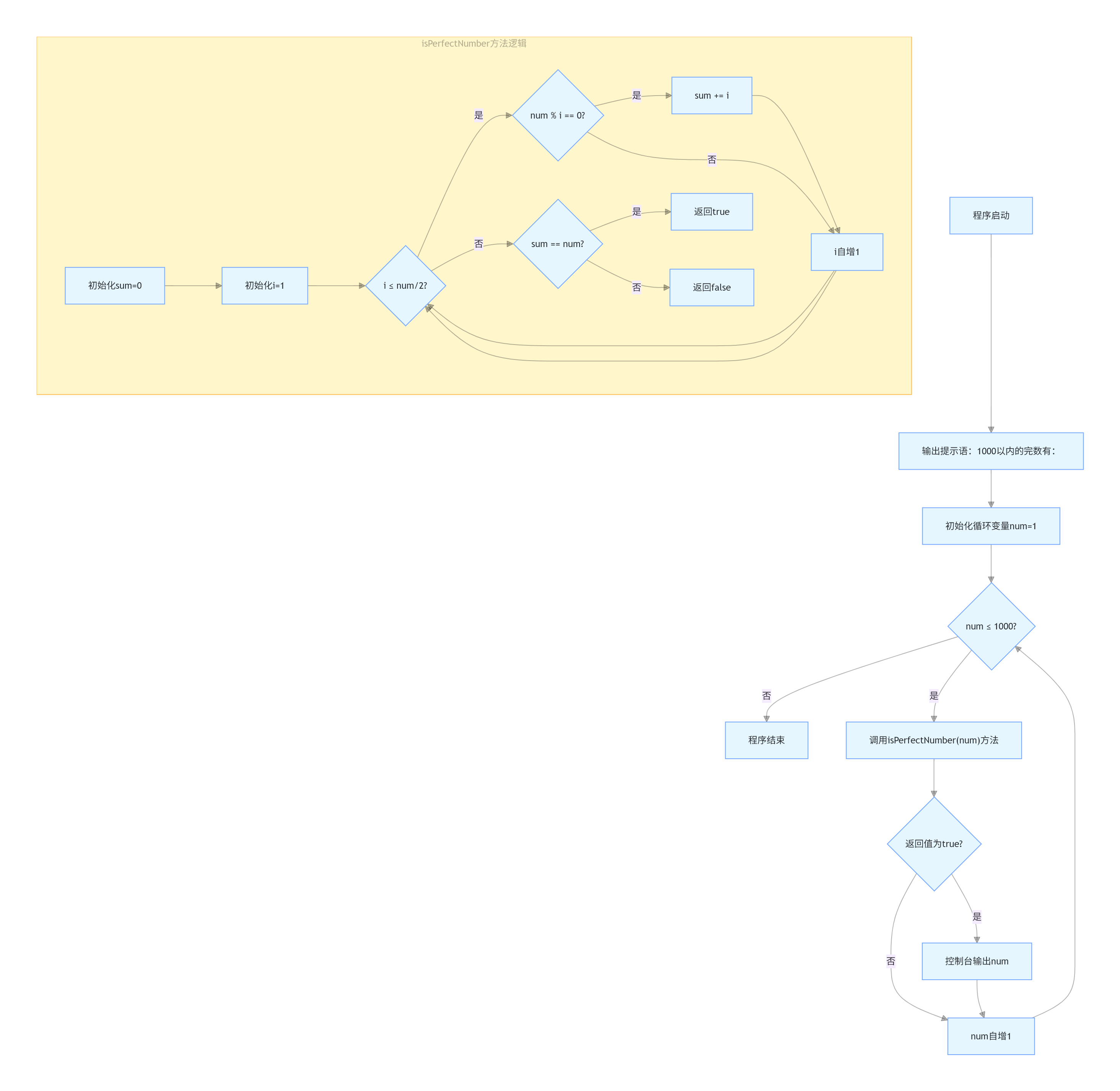 }main:isPerfectNumber 方法来判断它是否为完数。isPerfectNumber:number 作为参数。sum 为0,用于存储所有真因子的和。for 循环遍历从1到 number / 2 的所有整数(因为一个数的最大真因子不会超过它的一半)。i 是 number 的因子(即 number % i == 0),则将 i 加到 sum 中。sum 是否等于 number,如果是,则该数是完数。运行上述代码,输出将是1000以内的所有完数: