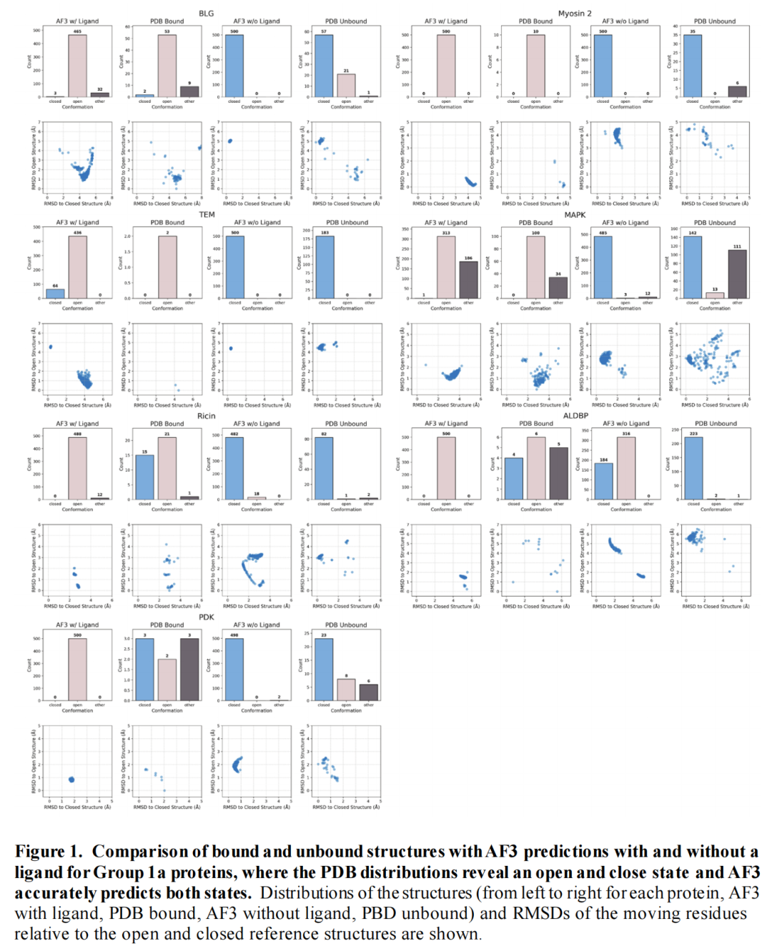 • 即使PDB中开放构象占比极低(如TEM、Ricin),AF3仍能在配体存在时优先采样开放构象;