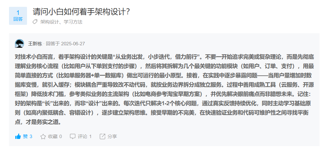 我以为小白的问题是没有人会回复的。没想到得到老师的回答。“业务出发,小步迭代,借力前行”。老师的话,我反反复复看了很多遍,架构师这个领域是我从没有接触的领域。在业余时间,我查阅与学习架构师的书籍,在这个领域探索。我感谢老师的回复,我迫切想要在工作中可以用到老师的建议。很遗憾,项目中没有用到,但是这种经验可以用在一些项目中。我也在不断学习中,不再陌生老师回答中的词语“高内聚低耦合、容错”。我也因为积累,敢于在工作提出一些与架构靠近的想法。