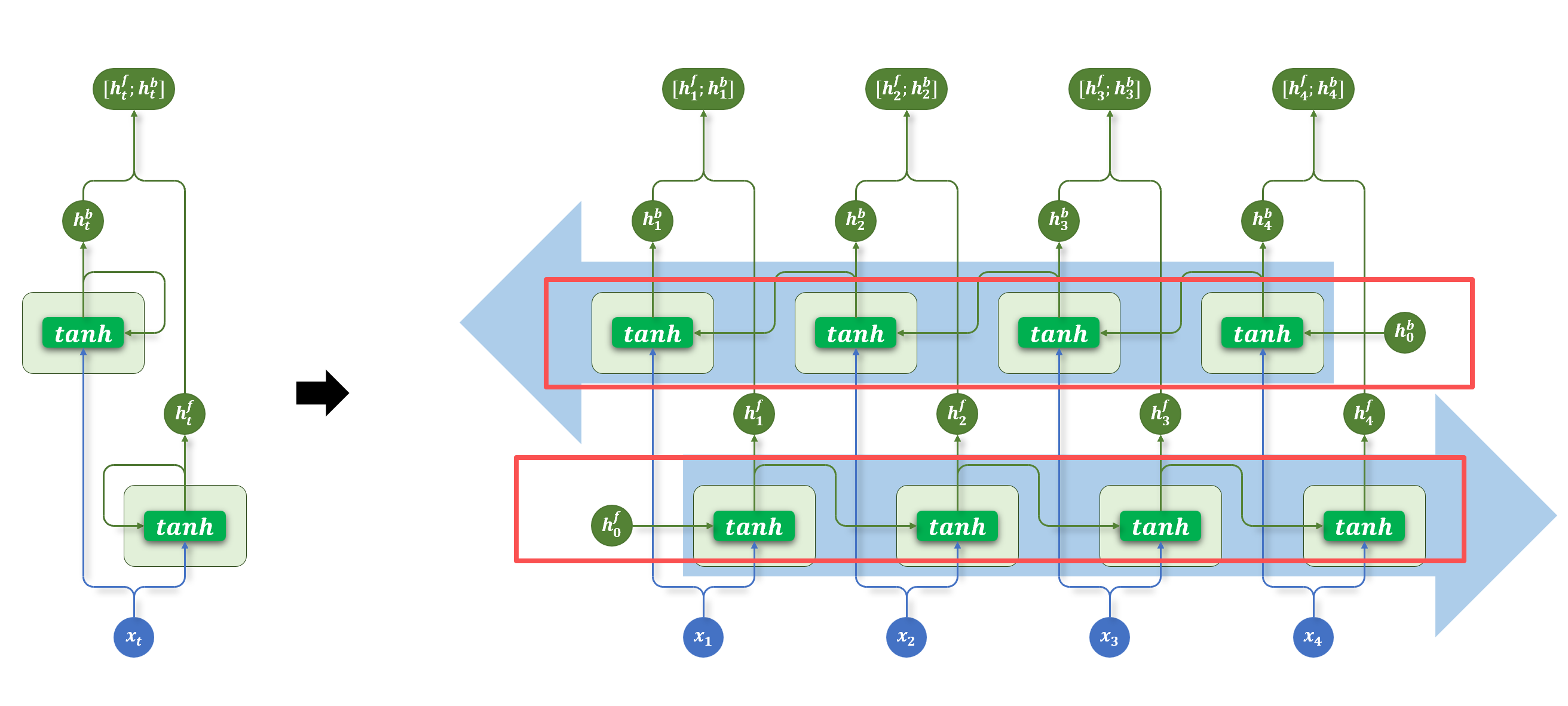 双向RNN的巧妙之处就在于它同时部署了两个“阅读器”:一个像我们平时一样从头读到尾(正向RNN),另一个则从尾到头反向阅读(反向RNN)。这样,对于序列中的每一个词,模型都能获得两个视角的上下文信息——一个来自它的“过去”,一个来自它的“未来”。