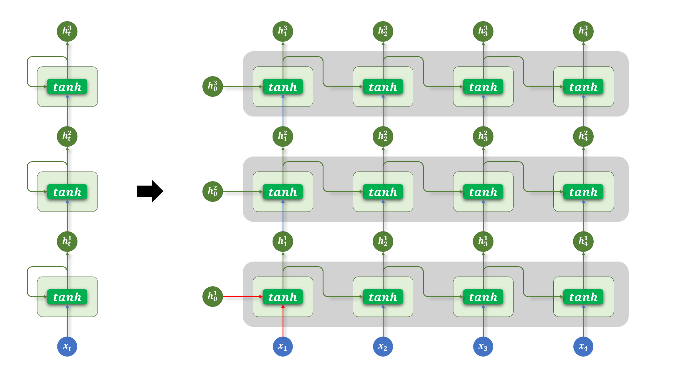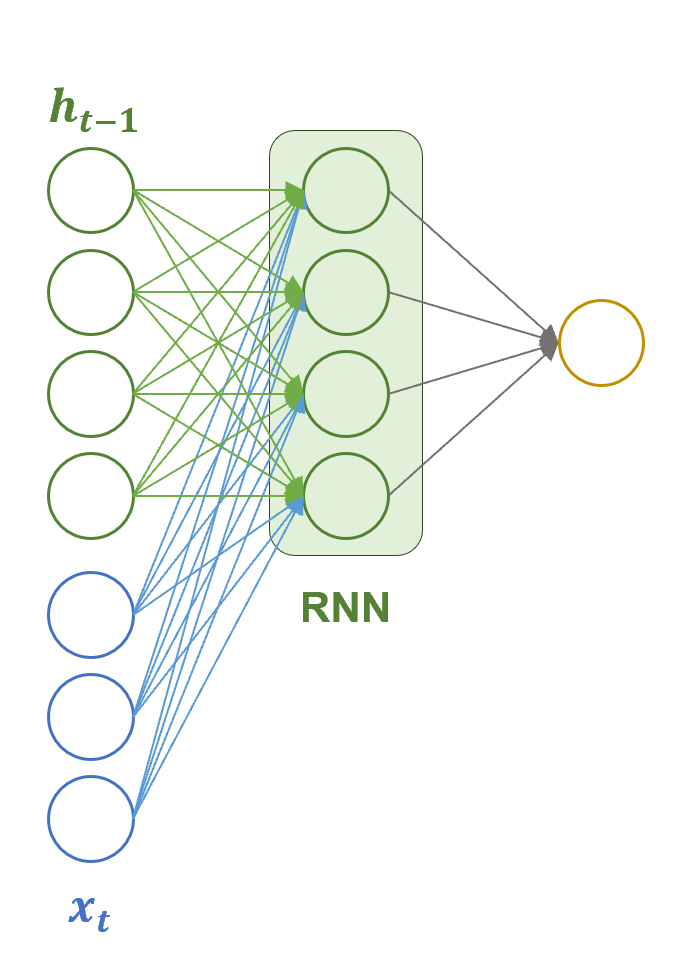 其中隐藏层的计算公式为 ht=tanhxtWx+ht−1Wh+b