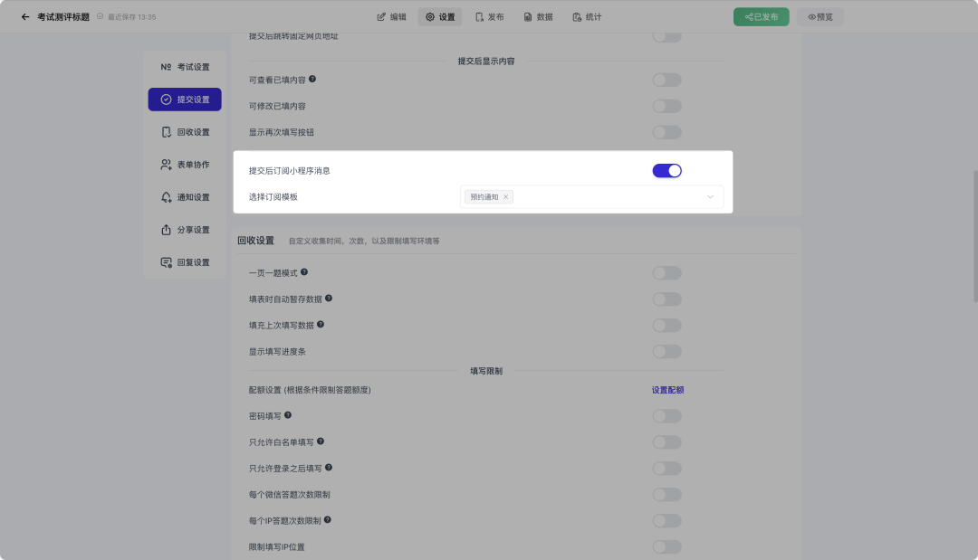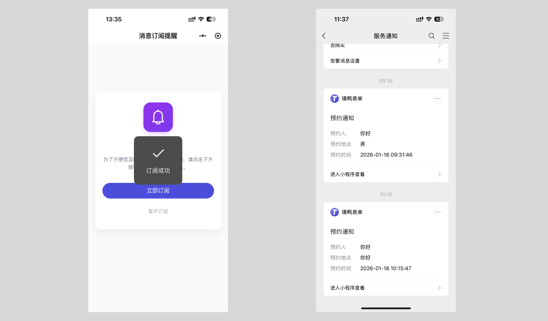 新增小程序订阅消息渠道,用户提交后可选择订阅服务通知,后续可以通过智能提醒将通过微信服务通知推送。