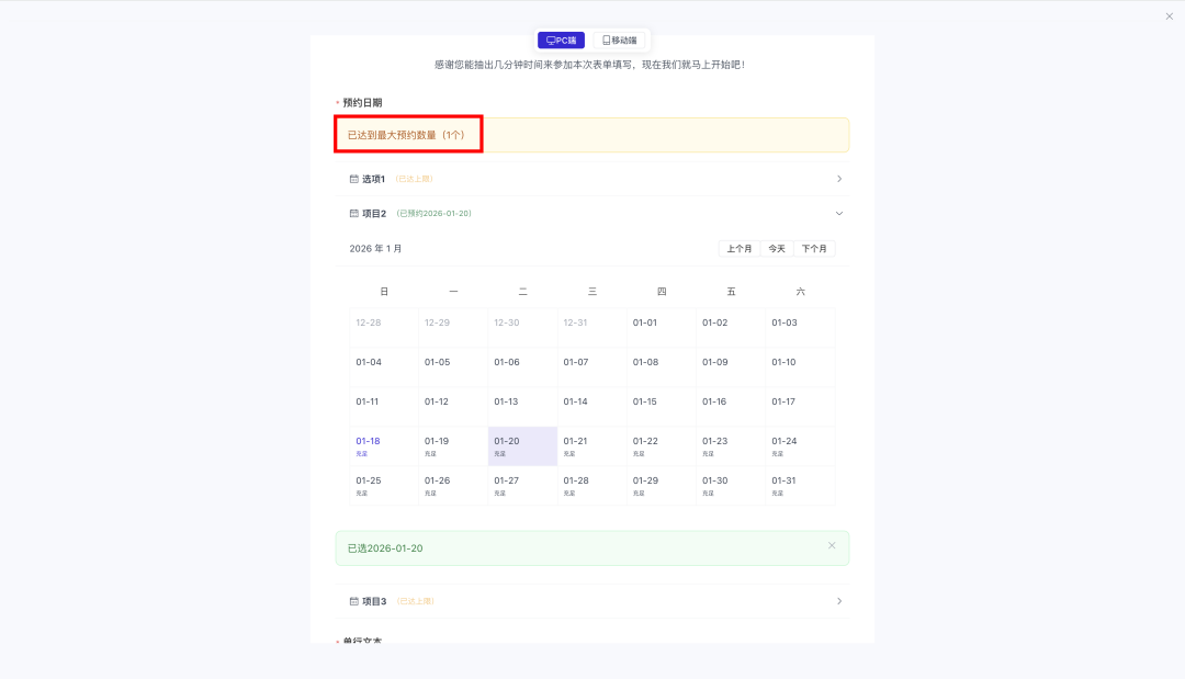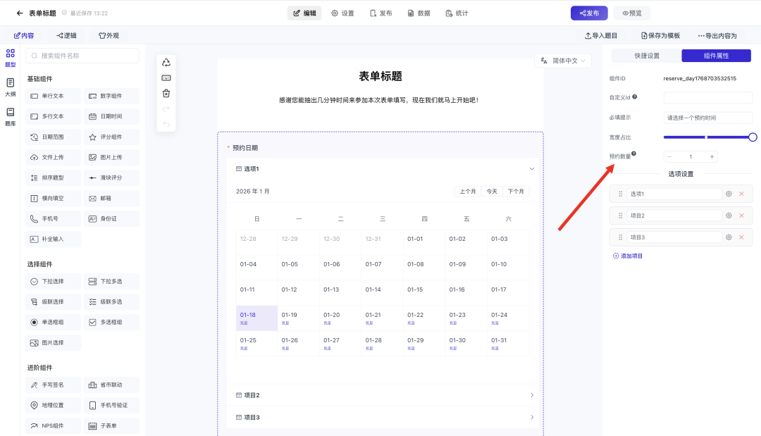 预约组件支持为每个预约项目设置数量上限,用于控制预约名额和资源分配。