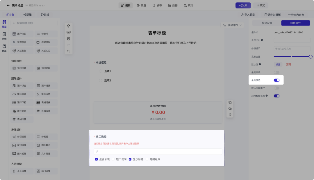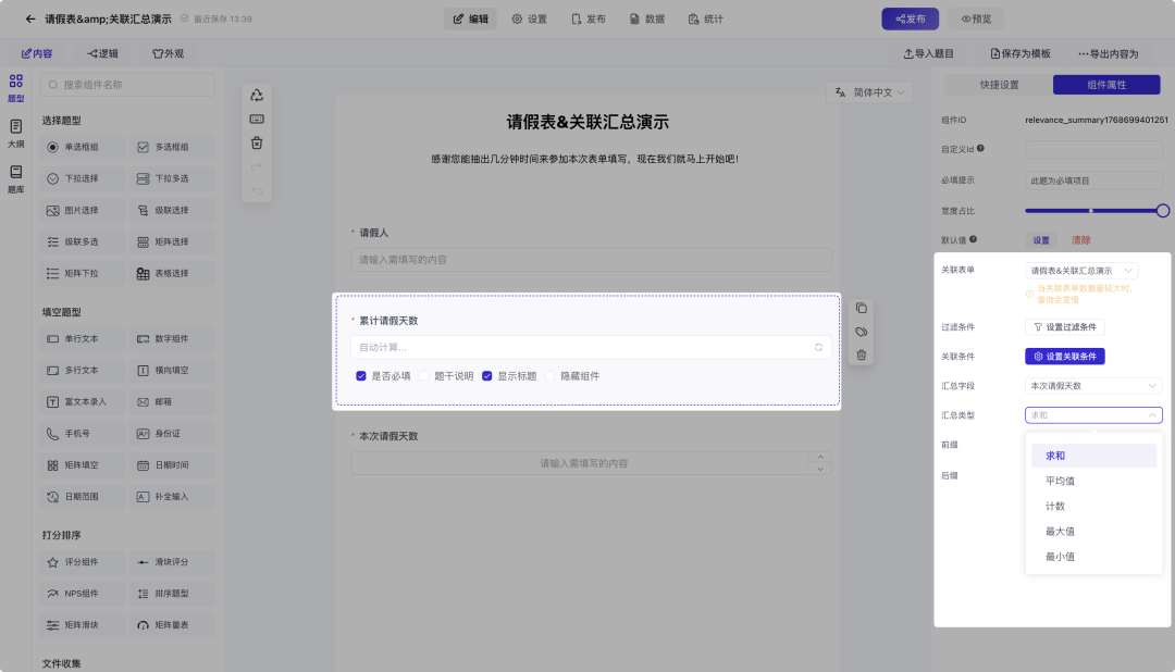 关联汇总组件支持关联其他表单的字段,并可对指定字段进行累加、平均值或计数统计。可用于销售额汇总或报销额度预警,跨表数据处理现在可以在表单内自动完成。