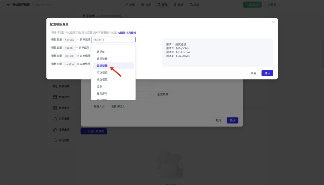 智能提醒新增维度链接,在考试测评场景中可以通过消息推送实现将维度报告发放给具体的某个用户。