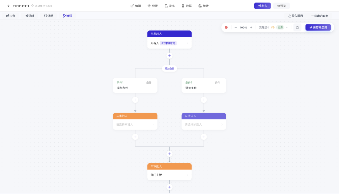部门主管审批支持发起时不指定人员,系统将根据发起人当前组织架构动态匹配审批人。