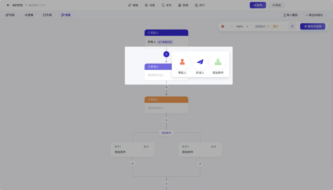 在审批流设计时可以选择抄送人,前台流程管理中新增「抄送给我」菜单。管理员可配置抄送节点的字段可见性,便于信息同步与管理。
