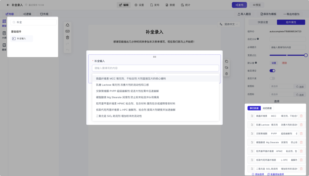 新增自动补全输入组件,通过组件属性预设联想词库,用户在输入关键词时系统会自动匹配并推荐完整信息,提升填写效率,同时保证数据规范性。