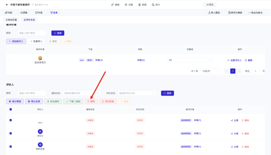 360 评估模块支持删除评价人,管理员可根据实际情况调整评价名单。