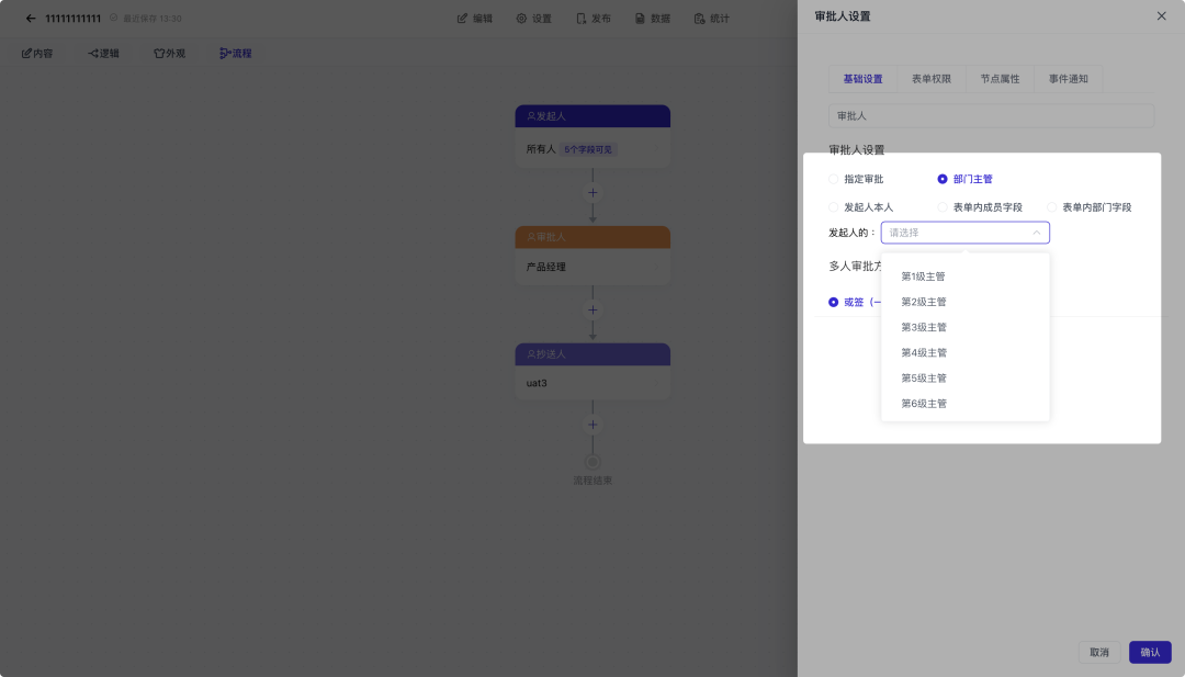 部门主管审批支持多人或签模式,同一部门内任意一位主管审批通过即可推进流程。