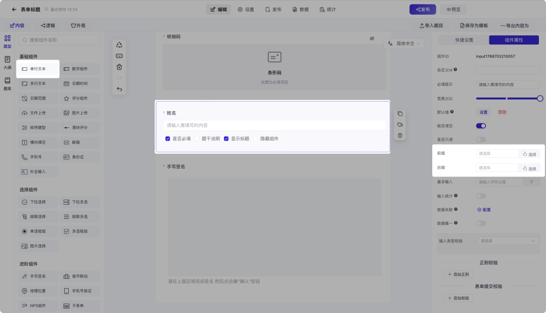 单行文本组件支持设置前后缀,如金额符号或单位,用于引导规范填写。