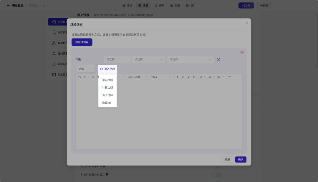 表单提交后的跳转链接支持插入 dataId 参数,可将当前提交数据的唯一 ID 传递给第三方系统。