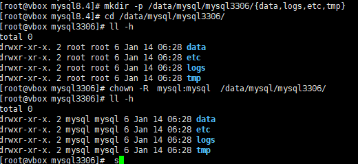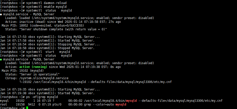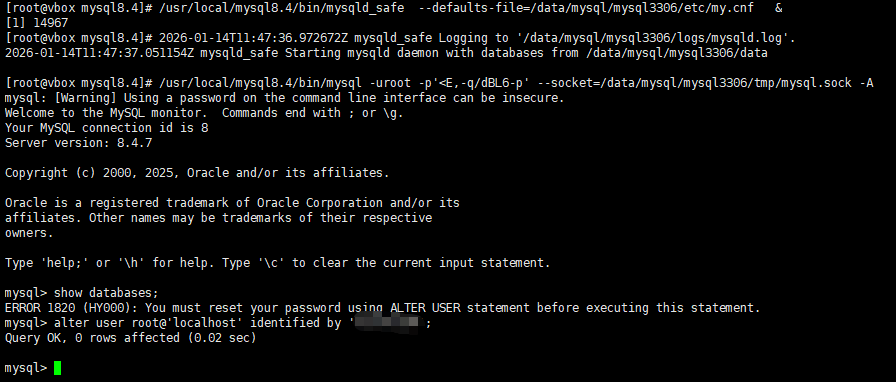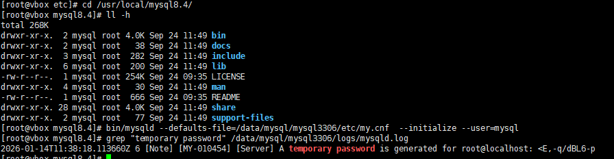 [root@vbox mysql8.4]# 2026-01-14T11:47:36.972672Z mysqld_safe Logging to '/data/mysql/mysql3306/logs/mysqld.log'.
