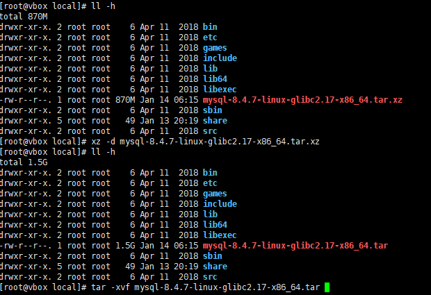 [root@vbox local]# xz -d mysql-8.4.7-linux-glibc2.17-x86_64.tar.xz