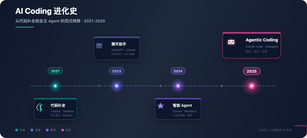 写在前面:站在 2025 年的岁末回望,这一年我们不再讨论"AI 是否会写代码",而是在讨论"如何与 AI 队友一起赢"。本文将带你复盘 2025 的高光时刻,并揭秘 2026 年即将席卷团队的 DDAD(文档驱动 AI 开发) 新玩法。