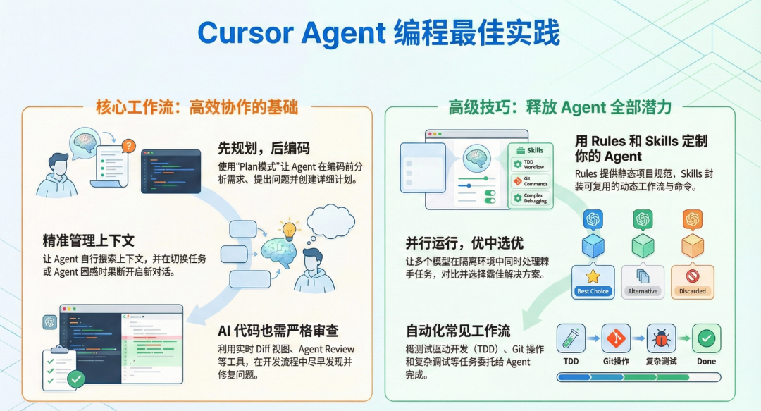为了让 Agent 更深度地融入你的工作流,Cursor 提供了两种强大的自定义方式:Rules(规则)提供静态的、始终生效的上下文,而 Skills(技能)则提供动态的、按需调用的能力。
