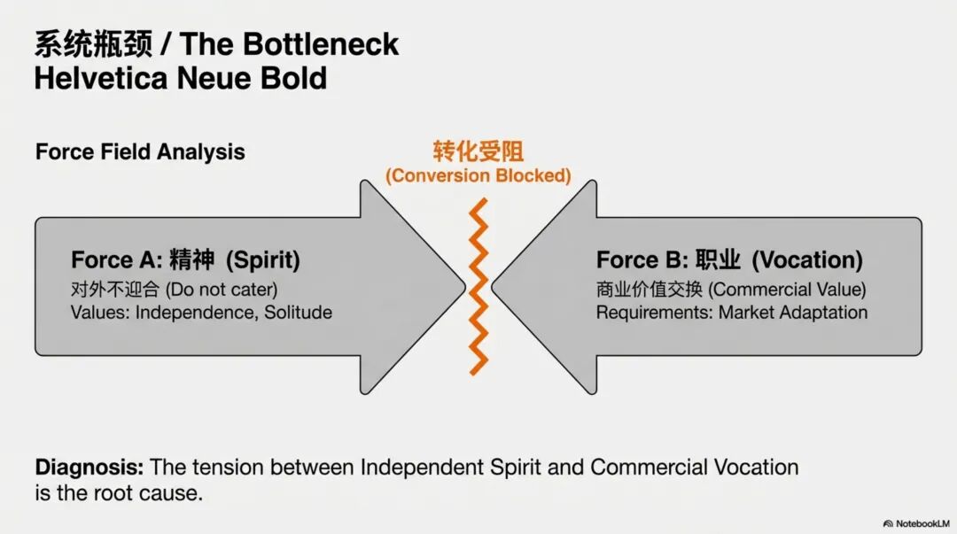 核心障碍:精神象限的"不迎合他人"与职业象限的"商业化需求"之间的张力