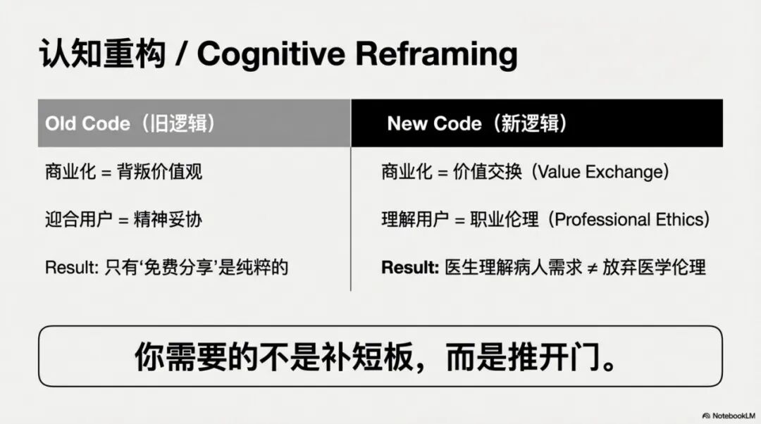 这扇门就是:从"个人卓越"到"社会价值创造"的跨越。这不是能力问题(你已经足够强大),而是心理障碍(害怕商业化会失去独立性)。