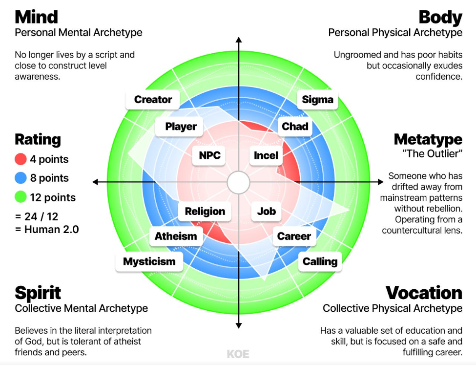 模型引入原型(Archetypes)和元类型(Metatypes)概念,原型是特定象限和层级中出现的人物模式,元类型则是个人四个象限原型的综合 The Dankoe。例如心智象限从NPC→玩家→创造者,身体象限从Beta→Alpha→Sigma,职业象限从工作→职业→使命,精神象限从宗教→无神论→神秘主义。通过评估各象限发展点数并计算平均值,可确定个人整体发展水平,识别需要突破的核心问题,制定个性化成长路径。