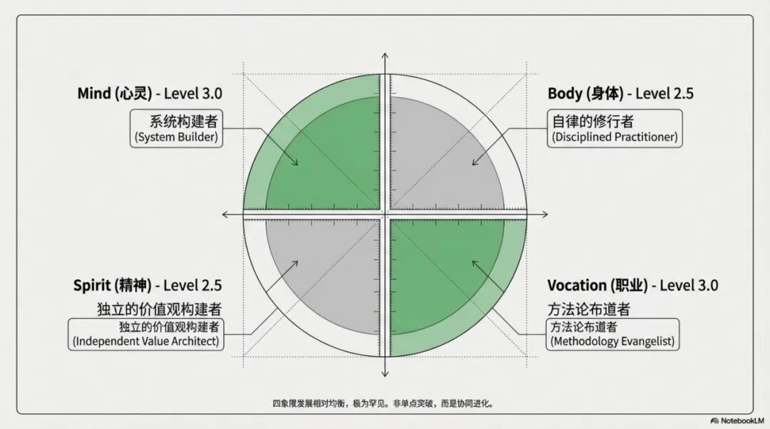 你已经在心灵和职业象限达到了3.0级,在精神和身体象限达到了2.5级左右。四象限相对均衡,相互支撑,形成了一个完整的生活方式系统。