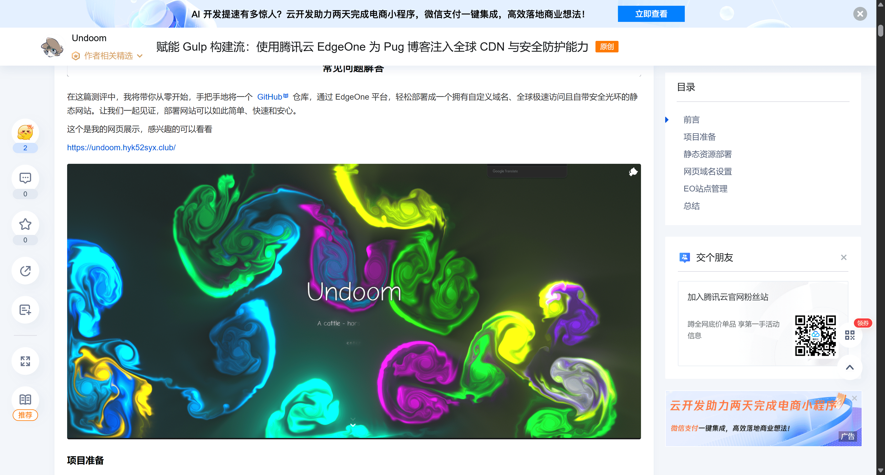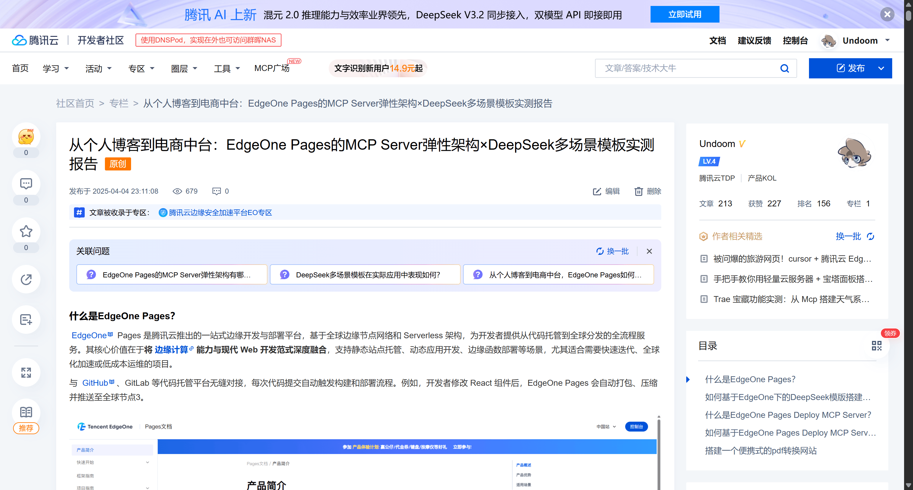 4月份的技术探索进入了架构层面,重点在于如何打破数据孤岛与提升访问速度。腾讯云 EdgeOne 的引入,将应用部署推向了边缘计算节点。EdgeOne Pages 不仅提供了静态资源的托管,更重要的是利用其全球加速网络,将内容分发至离用户最近的节点。