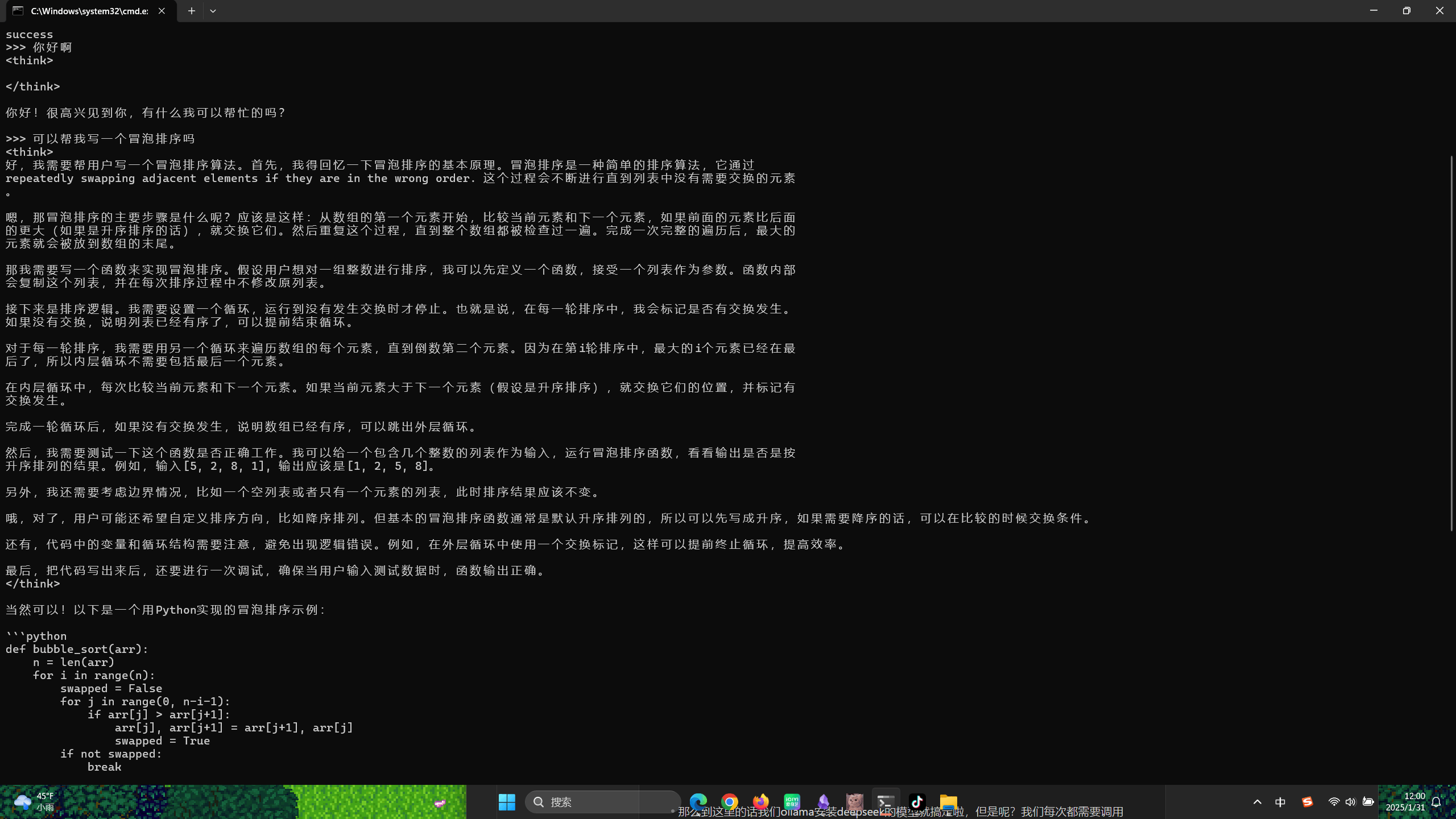 在本地终端的黑色背景与白色字符之间,第一次与 DeepSeek 的对话标志着个人开发模式的转变。此时的模型已经具备了极强的逻辑推理能力,能够理解复杂的上下文指令,而不再仅仅是简单的关键词匹配。