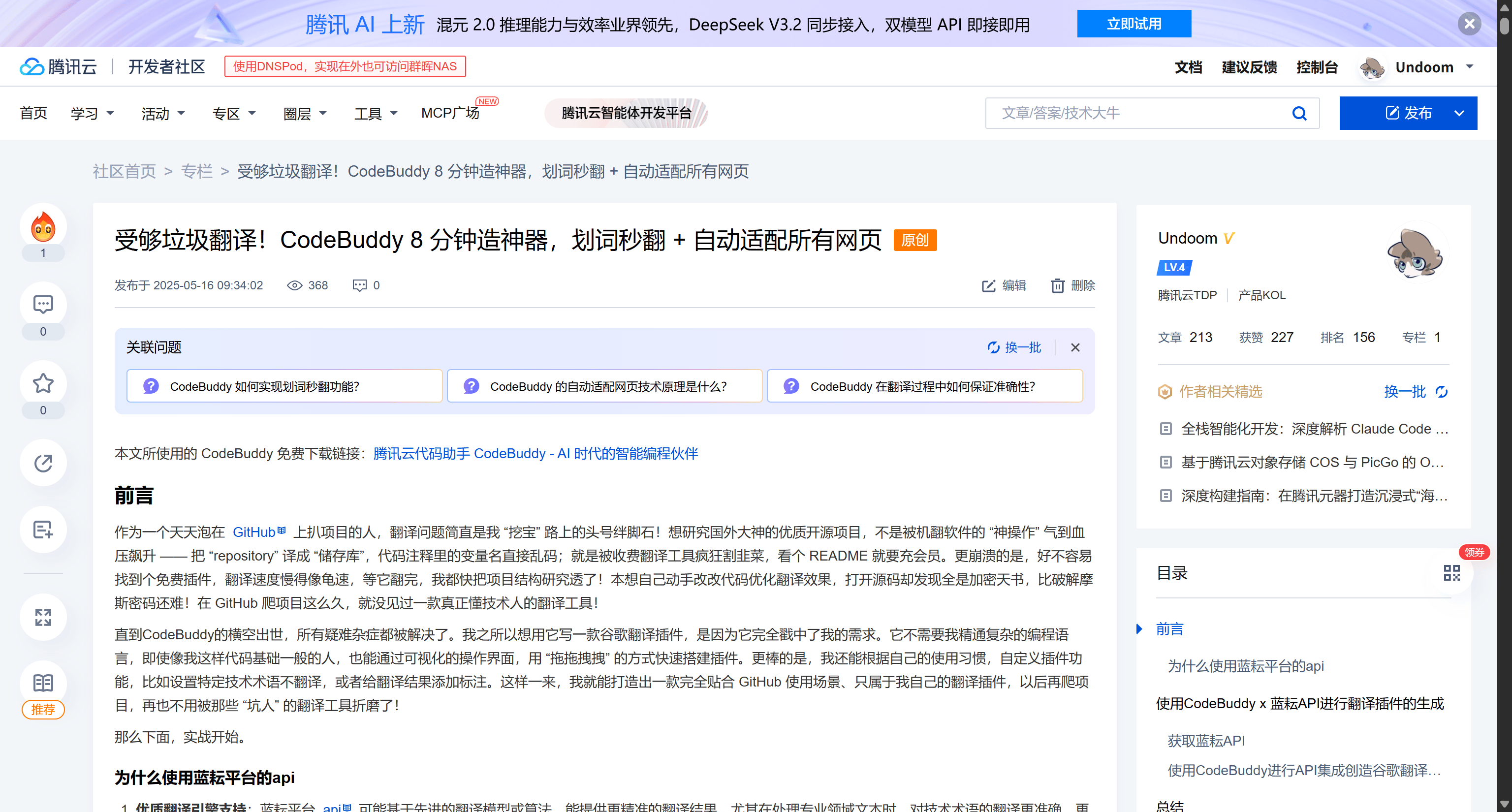 凭借对 CodeBuddy 的深度应用与技术解析,在年底的腾讯云大会上获得了最具价值原创作者的荣誉。这不仅是对个人技术探索的肯定,也是 AI 辅助开发模式逐渐成为主流的有力证明。