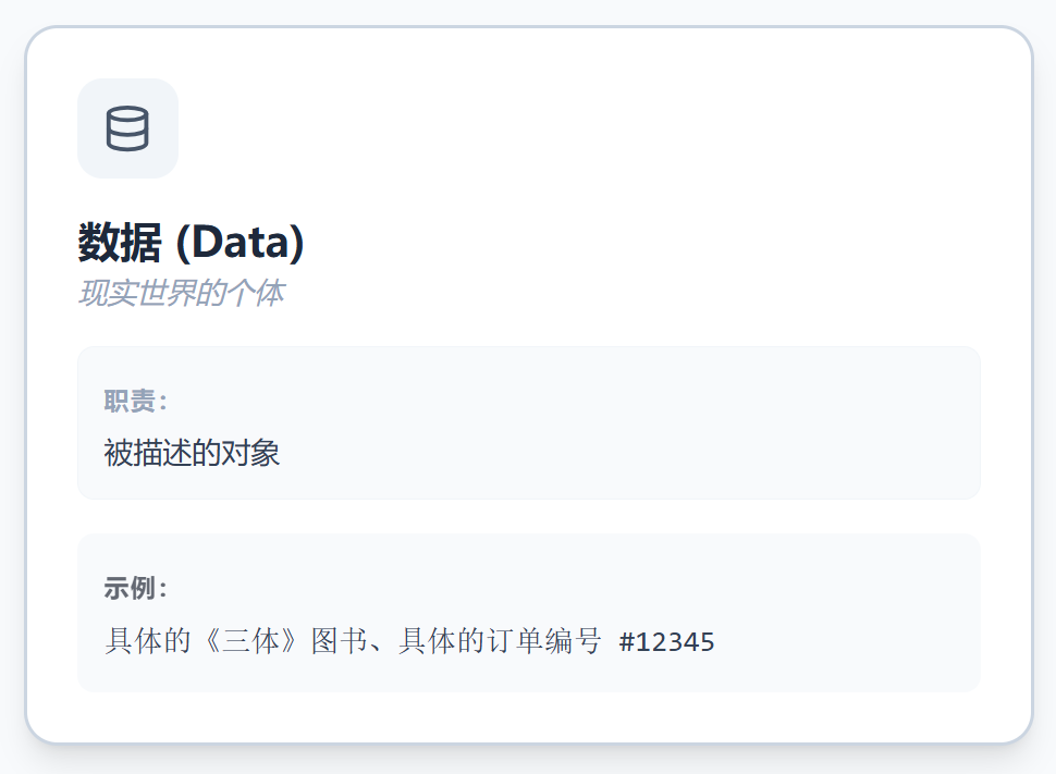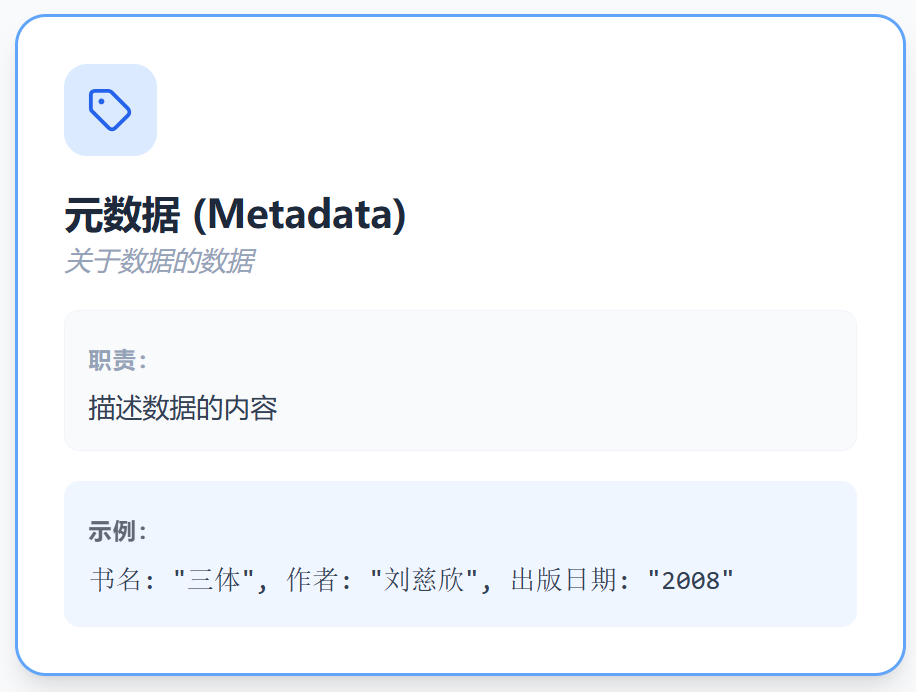 元数据:是《三体》这本书的“图书卡片”,上面写着:{书名: "三体", 作者: "刘慈欣", 分类: "科幻小说", 位置: "A-3架"}。