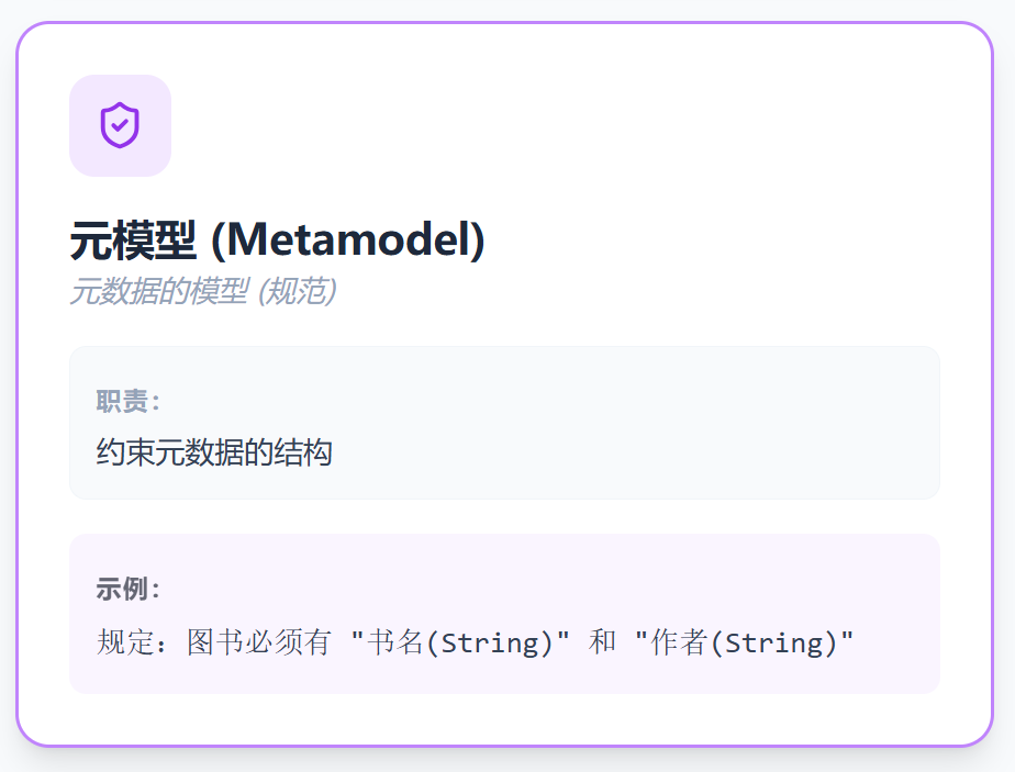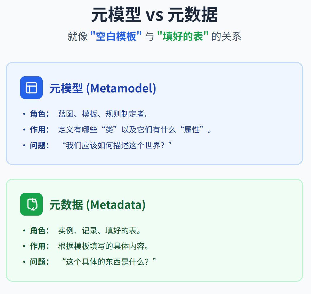 元模型(Metamodel):是蓝图、是模板、是规则。它定义了我们要描述哪些“事物”,以及这些“事物”之间有什么“关系”。它回答的是“我们应该如何描述这个世界?”的问题。